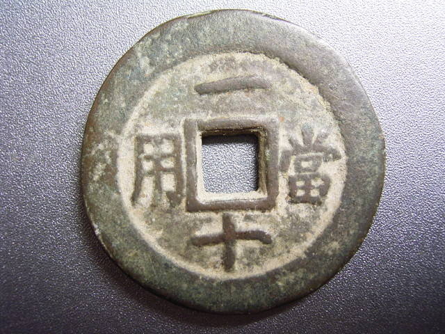 下面這二枚五十當用應是偽品,五十當用所有錢譜皆未載,若是真品,同一錢局,不 同面值而已,其字體應和一十當用一致。此幣和一十當用相比,字體不符且呆滯沒有 精神,加上鏽色觀看,非咸豐時鑄的真品。 局換局票目前而言,只發現《一十當用》這版式,是否會有其他版式出現,尚不敢斷 言,有待日後的出土。 |